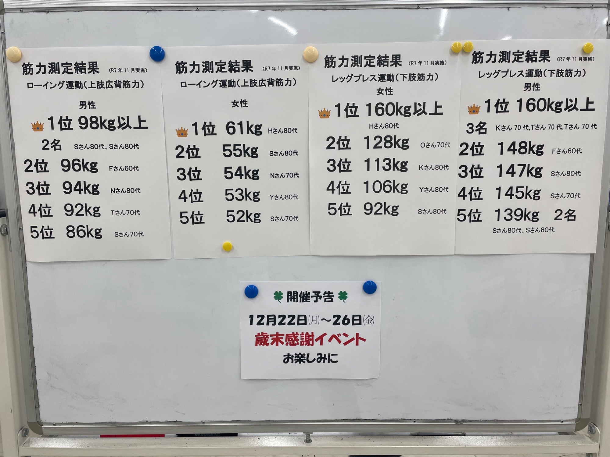 11月筋力測定を行いました。日々の努力が数値となって見ることができます。でも大切なのは『転ばずに暮らせること』です。柔軟性もバランスよく身に付けながら、運動を続けていきましょう。